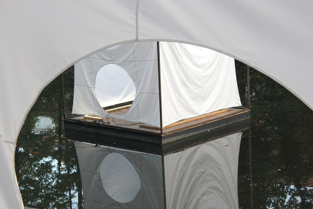 Dies waren unter anderem die Fragen, die ich den Studierenden als Aufgabenstellung gab. Es entstanden drei Stahlrahmen-Konstruktionen in die je eine kubische Stoffhülle aus Schirmseide gespannt wurde. Eine Basisstation mit circa 6 Metern Höhe und zwei schwimmfähige Satelliten von circa 2,50 Metern Kantenlänge. Jeder Kubus war begehbar und besaß einen kreisrunden Ausblick gen Himmel.