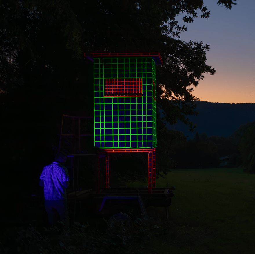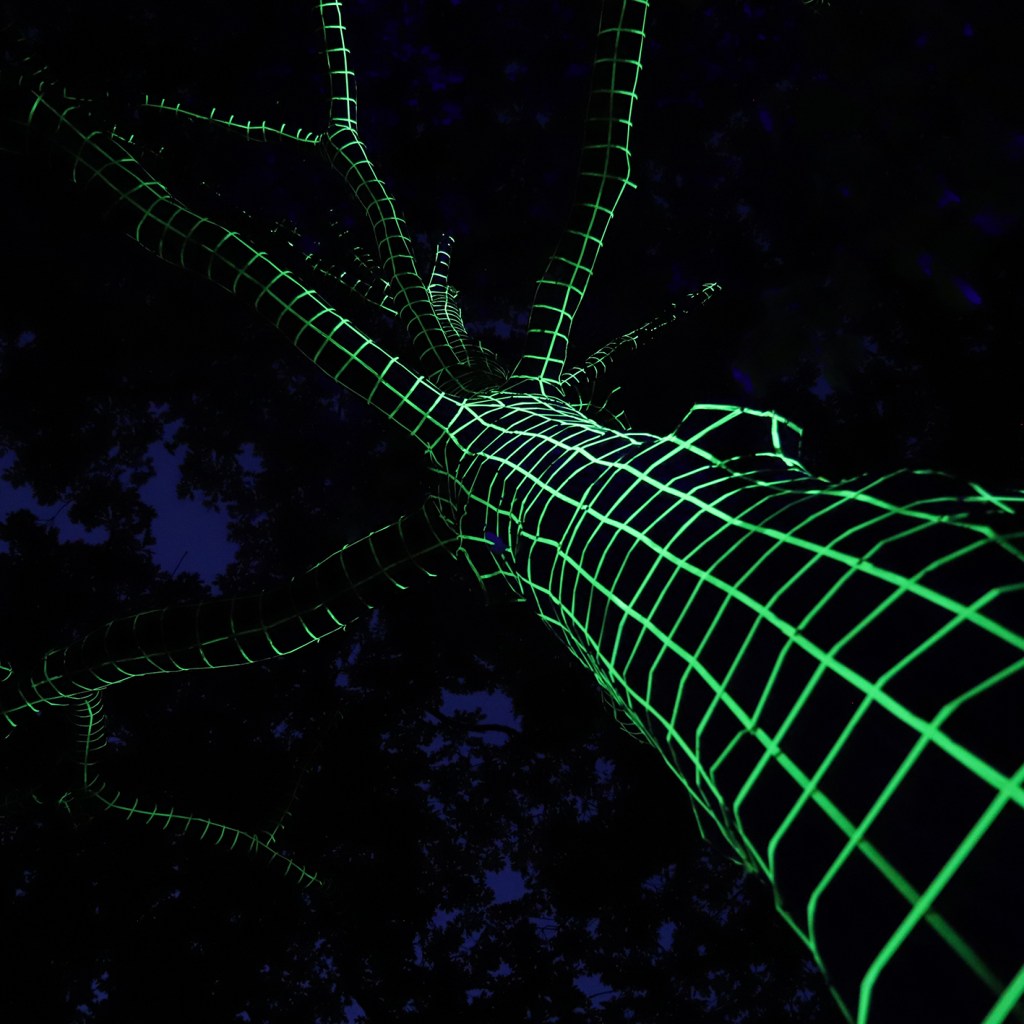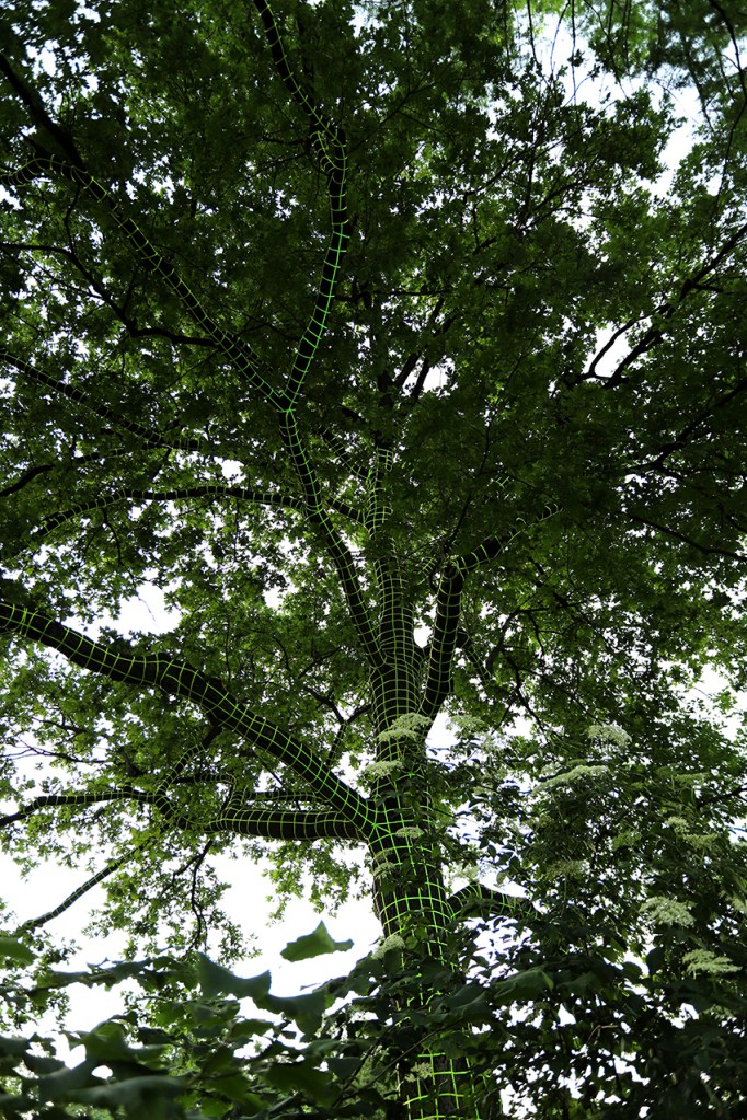 Der Baum im Skulpturenpark ist mit einem Raster aus Neontape beklebt. Selbst am Tage wirkt er wie ein digitaler Fremdkörper. Verschwinden dann am Abend die Farben des Parks in der Dunkelheit, erscheint der mit UV-Licht beleuchtete Baum wie ein Computer-generiertes Hologramm.
