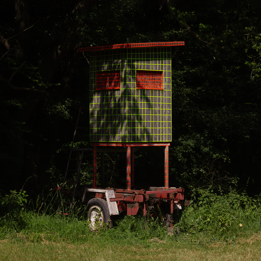 Der Titel „Watch Out“ bezieht sich in mehrfachem Wortsinn auf die Eigenschaften eines Hochsitzes. Das Hinausschauen als Beobachter, das Achtgeben auf die Gefahr Hochsitz selbst, oder leuchtend in der Nacht, um ihn sichtbar zu machen und als bedrohliches Artefakt in der Landschaft zu markieren. Mit UV Licht angestrahlt, erscheint der Hochsitz im Dunkeln, wie eine dreidimensionale Computergrafik und steht damit an der Schnittstelle zwischen analoger und digitaler Welt.