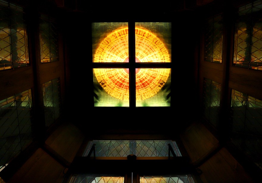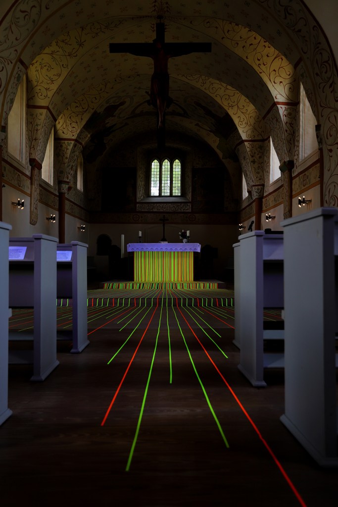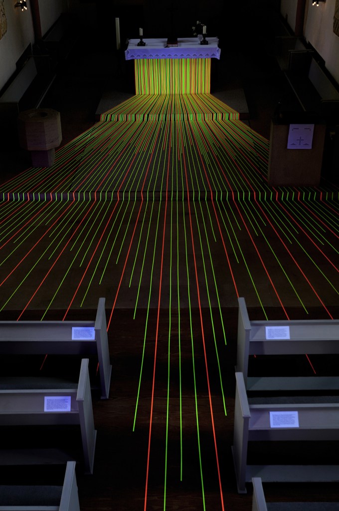 Die Strahlenkränze von Heiligenfiguren, auch Nimbus genannt, bilden die Vorlage für diese Installation. Vom zentralen Ort der Kirche, dem Altar ausgehend, breiten sich die Strahlen bis in die Sitzreihen der Gemeinde aus. Das Klebeband aus dem die Strahlen gefertigt wurden, ist mit einer Tagesleuchtfarbe beschichtet. Zusätzliches UV-Licht erhöht die Leuchtkraft und läßt die Strahlen mit Einbruch der Dämmerung wie von selbst erstrahlen.