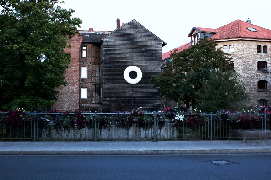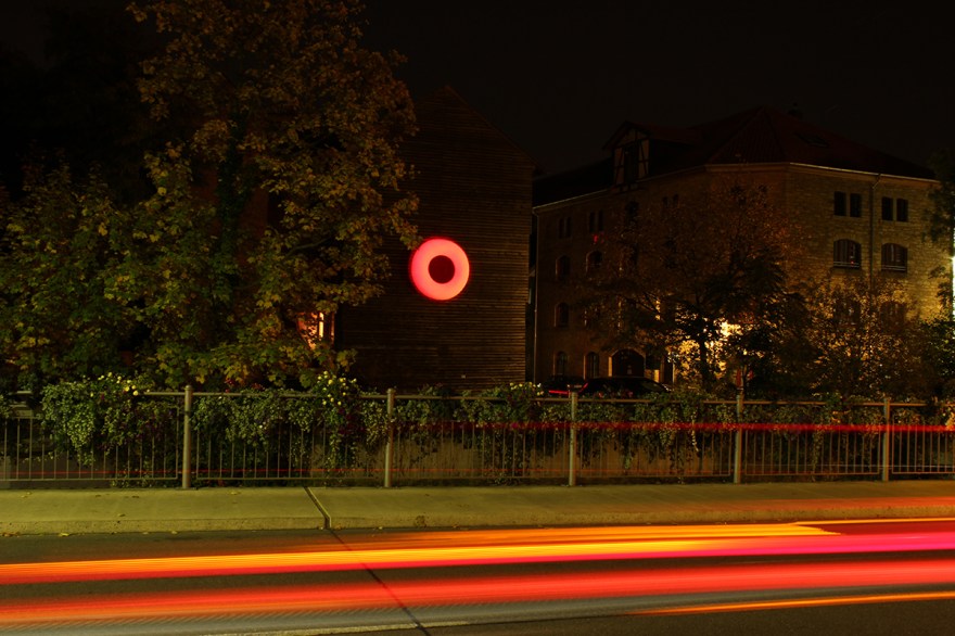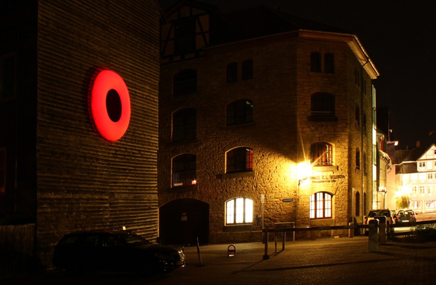 Wie eine große Zielscheibe leuchtet diese Installation auf einem Giebel in Wolfenbüttel. Bei Tag vom Sonnenlicht erhellt, wird das drei Meter im Durchmesser große Relief nachts mit rotem Licht angestrahlt.