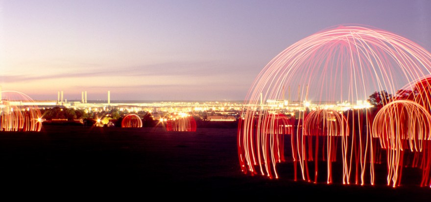 Das Iglu als Archetyp des Hauses steht im krassen Widerspruch zur urbanen Industrielandschaft einer Stadt wie Wolfsburg. Die neun roten Iglus haben einen Platz hoch über der Stadt okkupiert und distanzieren sich räumlich und formal vom Industriellen Zentrum gegenüber.
