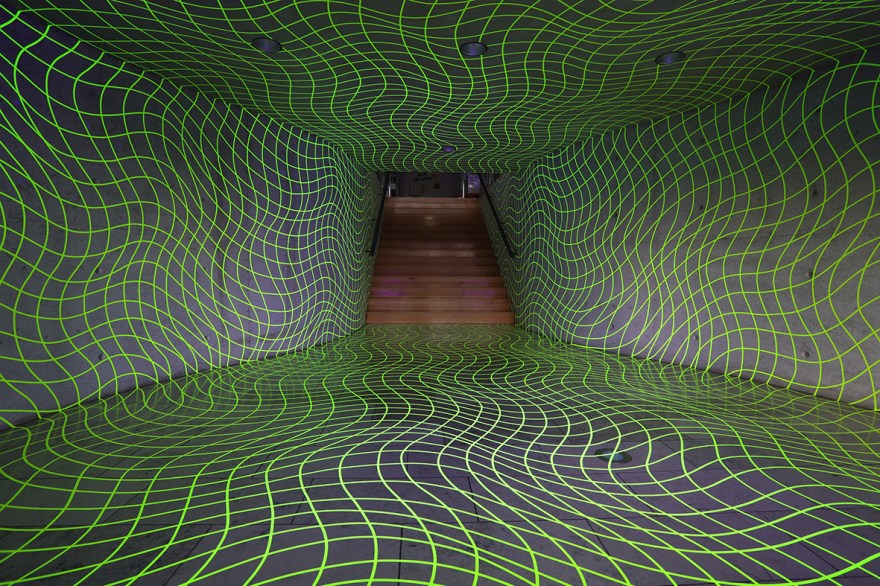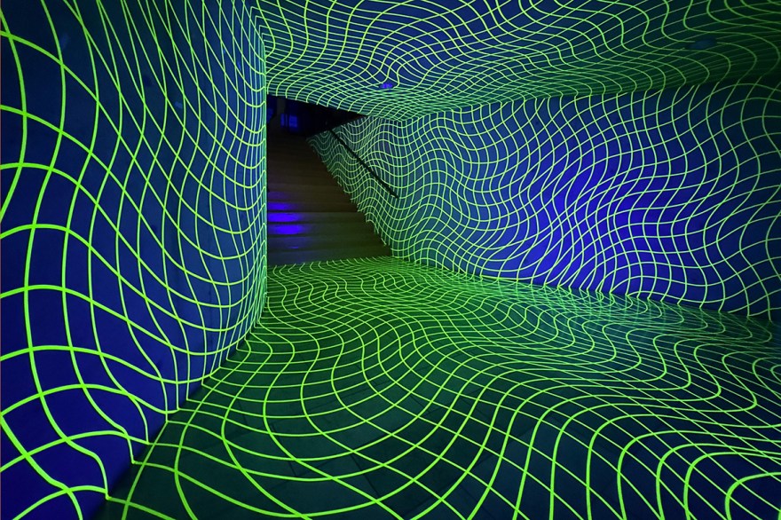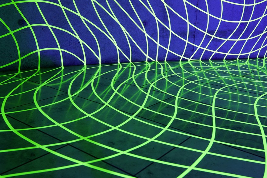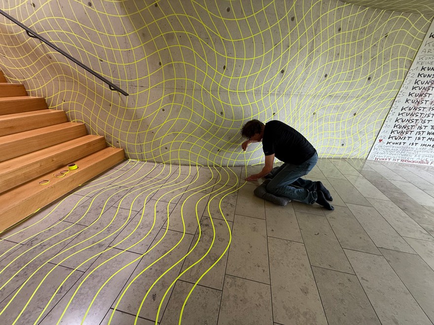 „Unsere Welt ist schön!?“ Zu diesem Thema gestaltete ich den Eingangsbereich der Kunststation Kleinsassen. Knapp 2,5km Klebeband sind verklebt und verformen Boden, Decke und Wände. So unsicher wie die Fragestellung wird hierdurch auch der Zugang in die Ausstellungsräume. Durch den Einsatz von UV Licht, mit Einbruch der Dunkelheit, ist die Verkrümmung des Raumes am intensivsten zu erleben.